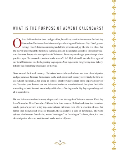 WHAT IS THE PURPOSE OF ADVENT CALENDARS?Okay. Full confession here. As I get older, I would say that it%u2019s almost more fun looking forward to Christmas than it is actually celebrating on Christmas Day. Don%u2019t get me wrong, I love Christmas morning and all the presents and joy like the rest of us. But the more I understand the historical significance and meaningful aspects of the holiday season, the more I enjoy the anticipation of Christmas. Does anyone else get goosebumps when you first spot Christmas decorations in the stores? I do! My kids and I love the first sight of our local Christmas tree lot beginning to go up or a Yule log cake in the grocery store bakery. It hints that something exciting is on the way. Since around the fourth century, Christians have celebrated Advent as a time of anticipation and preparation. German Protestants in the mid-nineteenth century were likely the first to use Advent calendars, after using all sorts of creative ways to mark these important days of the Christian year. Parents can use Advent calendars as a teachable tool that gives their kids something to look forward to each day while also ref lecting on the big day approaching and all it symbolizes. We see Advent calendars in many shapes and sizes during the Christmas season. Each day from November 30 to December 25 has a little door to open. Behind each door is a chocolate candy, part of a picture, a tiny toy%u2014some Advent calendars even offer a selection of teas. But rather than being about treats or trinkets, the calendar is a kind of devotional. The word advent, which comes from Latin, means %u201ccoming to%u201d or %u201carriving at.%u201d Advent, then, is a time of anticipation when we look forward to the arrival of Jesus.3
