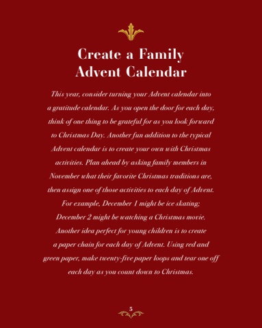 Create a Family Advent CalendarThis year, consider turning your Advent calendar into a gratitude calendar. As you open the door for each day, think of one thing to be grateful for as you look forward to Christmas Day. Another fun addition to the typical Advent calendar is to create your own with Christmas activities. Plan ahead by asking family members in November what their favorite Christmas traditions are, then assign one of those activities to each day of Advent. For example, December 1 might be ice skating; December 2 might be watching a Christmas movie. Another idea perfect for young children is to create a paper chain for each day of Advent. Using red and green paper, make twenty-five paper loops and tear one off each day as you count down to Christmas.5