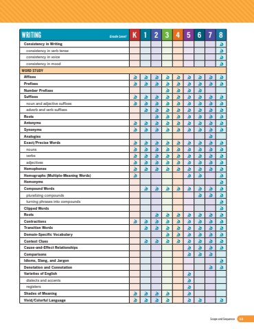 WRITING Grade Level K1 2345678Consistency in Writingconsistency in verb tenseconsistency in voiceconsistency in moodWORD STUDYAffixesPrefixesNumber PrefixesSuffixesnoun and adjective suffixesadverb and verb suffixesRootsAntonymsSynonymsAnalogiesExact/Precise WordsnounsverbsadjectivesHomophonesHomographs (Multiple-Meaning Words)HomonymsCompound Wordspluralizing compoundsturning phrases into compoundsClipped Words Roots ContractionsTransition Words Domain-Specific VocabularyContext CluesCause-and-Effect RelationshipsComparisonsIdioms, Slang, and Jargon Denotation and Connotation Varieties of Englishdialects and accentsregistersShades of MeaningVivid/Colorful LanguageT-648 VOYAGES IN ENGLISHScope and Sequence 13