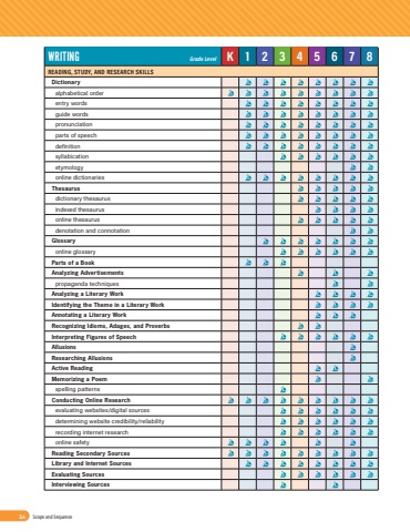WRITING Grade Level K1 2345678READING, STUDY, AND RESEARCH SKILLSDictionaryalphabetical orderentry wordsguide wordspronunciation parts of speechdefinitionsyllabicationetymologyonline dictionariesThesaurusdictionary thesaurusindexed thesaurusonline thesaurusdenotation and connotationGlossaryonline glossaryParts of a BookAnalyzing Advertisementspropaganda techniquesAnalyzing a Literary WorkIdentifying the Theme in a Literary WorkAnnotating a Literary WorkRecognizing Idioms, Adages, and ProverbsInterpreting Figures of SpeechAllusionsResearching AllusionsActive ReadingMemorizing a Poemspelling patternsConducting Online Researchevaluating websites/digital sourcesdetermining website credibility/reliabilityrecording internet researchonline safetyReading Secondary SourcesLibrary and Internet Sources Evaluating SourcesInterviewing SourcesSCOPE AND SEQUENCE T-64914 Scope and Sequence