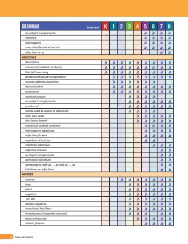GRAMMAR Grade Level K12345678as subject complementsintensiveinterrogativemasculine/feminine/neutralafter than or asADJECTIVESdescriptivenumerical (cardinal numbers)that tell how many positive/comparative/superlativearticles (definite/indefinite)demonstrativepossessivecommon/properas subject complementsposition ofwords used as nouns or adjectiveslittle, less, leastfew, fewer, fewestnumerical (ordinal numbers)interrogative adjectivesadjective phrasesrepetition of articlesindefinite adjectivesadjective clausesas object complementsparticipial adjectivescomparisons with as . . . as and so . . . asinfinitives as adjectivesADVERBSmannertimeplacenegation-er/-estdouble negativesmore/most, less/leasttroublesome (frequently misused)there is/there areadverb phrasesSCOPE AND SEQUENCE T-6394 Scope and Sequence
