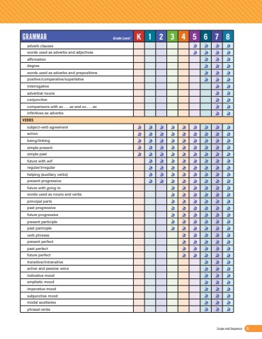 GRAMMAR Grade Level K12345678adverb clauseswords used as adverbs and adjectivesaffirmationdegreewords used as adverbs and prepositionspositive/comparative/superlativeinterrogativeadverbial nounsconjunctivecomparisons with as . . . as and so . . . asinfinitives as adverbs VERBSsubject-verb agreementactionbeing/linkingsimple presentsimple pastfuture with willregular/irregularhelping (auxiliary verbs)present progressivefuture with going towords used as nouns and verbsprincipal partspast progressivefuture progressivepresent participlepast participleverb phrasespresent perfectpast perfectfuture perfecttransitive/intransitiveactive and passive voiceindicative moodemphatic moodimperative moodsubjunctive moodmodal auxiliariesphrasal verbsT-640 VOYAGES IN ENGLISHScope and Sequence 5