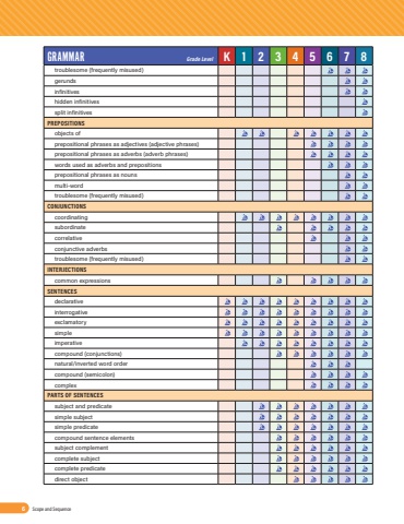 GRAMMAR Grade Level K1 2345678troublesome (frequently misused)gerundsinfinitiveshidden infinitivessplit infinitivesPREPOSITIONSobjects ofprepositional phrases as adjectives (adjective phrases)prepositional phrases as adverbs (adverb phrases)words used as adverbs and prepositionsprepositional phrases as nouns multi-wordtroublesome (frequently misused)CONJUNCTIONScoordinatingsubordinatecorrelativeconjunctive adverbstroublesome (frequently misused)INTERJECTIONScommon expressionsSENTENCESdeclarativeinterrogativeexclamatorysimpleimperativecompound (conjunctions)natural/inverted word ordercompound (semicolon)complexPARTS OF SENTENCESsubject and predicatesimple subjectsimple predicatecompound sentence elementssubject complementcomplete subjectcomplete predicatedirect objectSCOPE AND SEQUENCE T-6416 Scope and Sequence