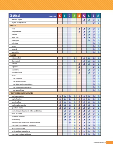 GRAMMAR Grade Level K1 2345678indirect objectobject complementPHRASESverbprepositionaladverbadjectiveparticipialinfinitivenoungerundappositiveCLAUSESindependentdependentadverbadjectiverestrictivenonrestrictivenounas subjectsas direct objectsas objects of prepositionsas subject complementsas appositivesPUNCTUATION / CAPITALIZATIONend punctuationcapitalizationapostrophesexclamation pointsquestion marksperiods/capitalization in titles and initialstitles of workscommas in seriesunderliningperiods/capitalization in abbreviationscommas in compound sentenceswriting addresseswriting direct quotationscommas in direct addressT-642 VOYAGES IN ENGLISHScope and Sequence 7