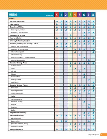 WRITING Grade Level K12345678GENRESPersonal NarrativesDescriptionsExpository Writingbook report/review expository article/essayBiographical WritingHow-to ArticlesLiterary Reflection/AnalysisBusiness, Formal, and Friendly Lettersfriendly (personal) letterbusiness or formal letterletter of complaintletter of inquiryletter of thanks or congratulationsletter of applicationCreative Writing: Proserealistic fictionfabletall talefolktaletrickster talefantasy fictionplay/scriptCreative Writing: Poetryfree verserhyming stanzasrhyming coupletshaikunonsense versenarrative poetrysonnetlimerickballadArgumentative WritingPersuasive Writingadvertisementbook reviewpersuasive article/essayconsumer reviewResearch ReportsT-644 VOYAGES IN ENGLISHScope and Sequence 9